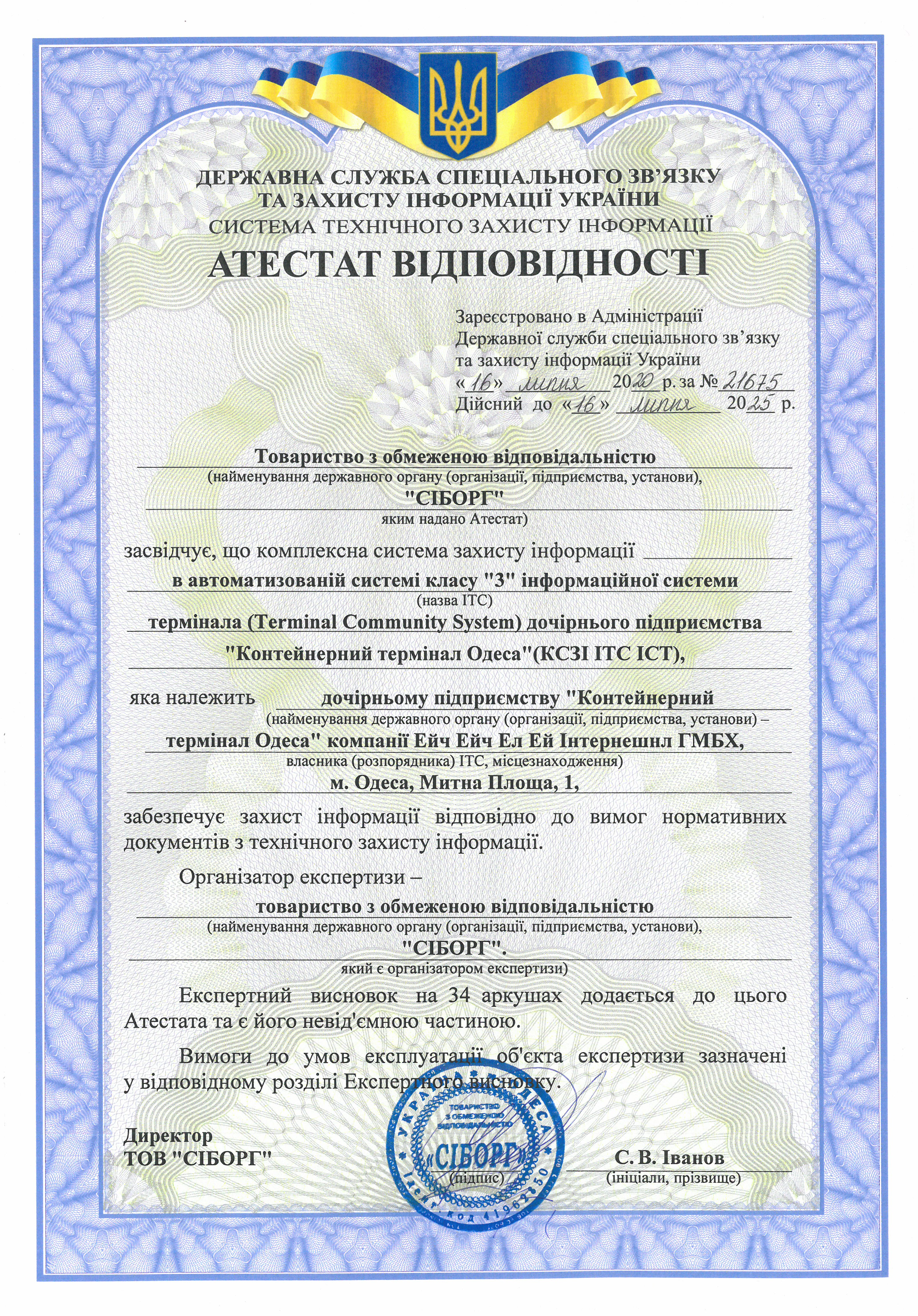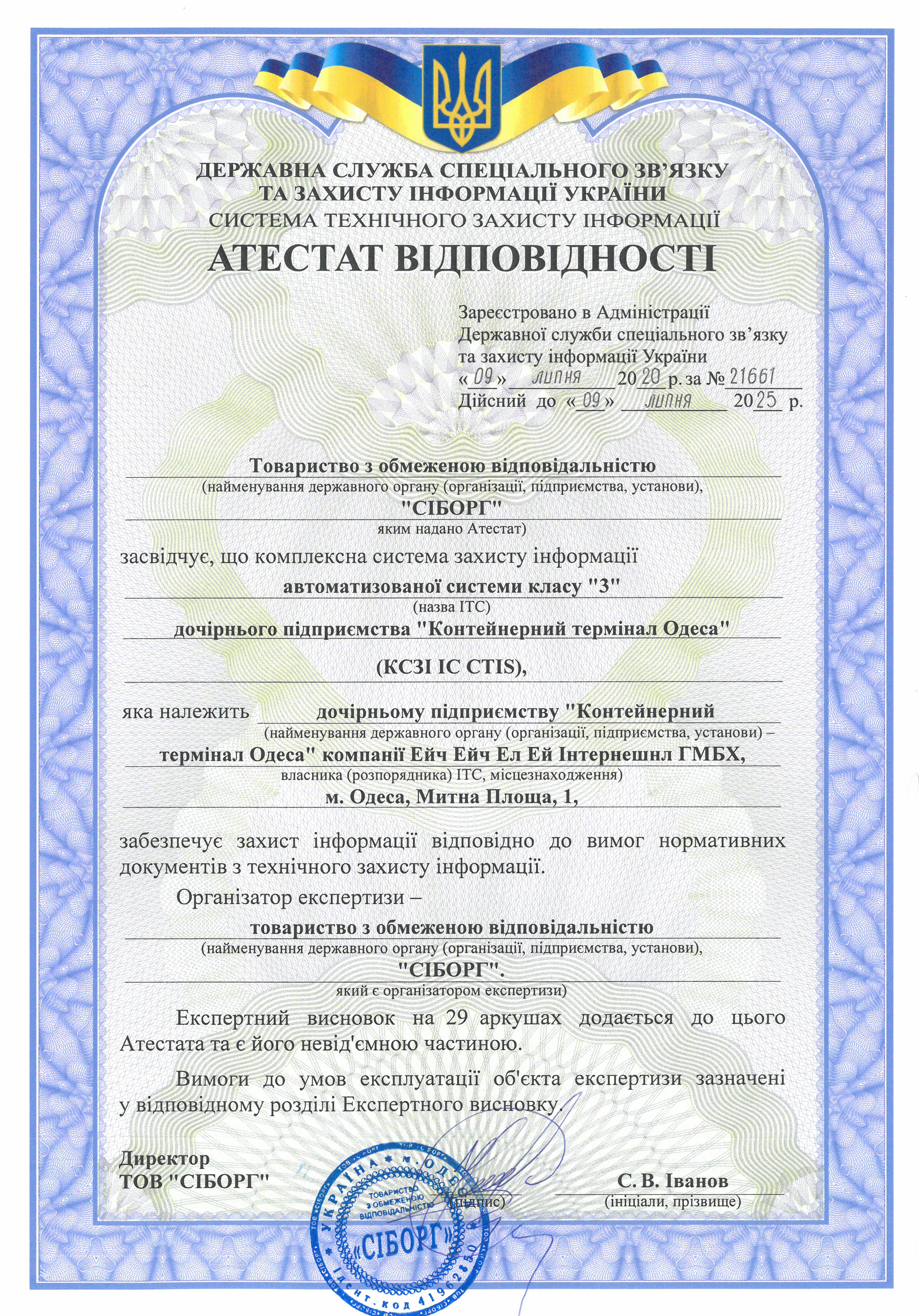 Компанія ДП «КТО» отримала Атестат відповідності, який підтверджує, що інформаційні системи CTIS (Container Terminal Information System) та TCS (Termainal Community System) контейнерного термінала забезпечують захист інформації відповідно до вимог нормативних документів системи технічного захисту України.